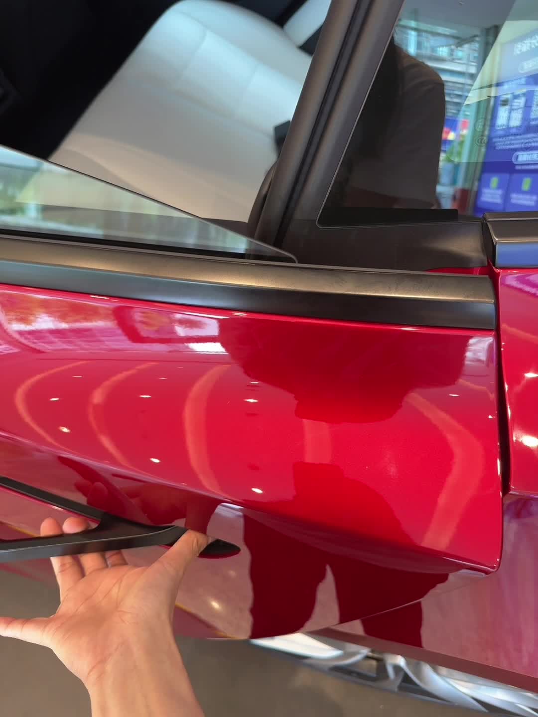 我去打卡了特斯拉位于广州万菱汇广场的展台 不大,但人爆多,因为进门就是 看看这个全新特斯拉Model 3的车门,感觉有点东西的,视频里面看到了吗,轻按之后,微微的弹出来了…… 比之前高级 特斯拉全新Model 3车门有点东西