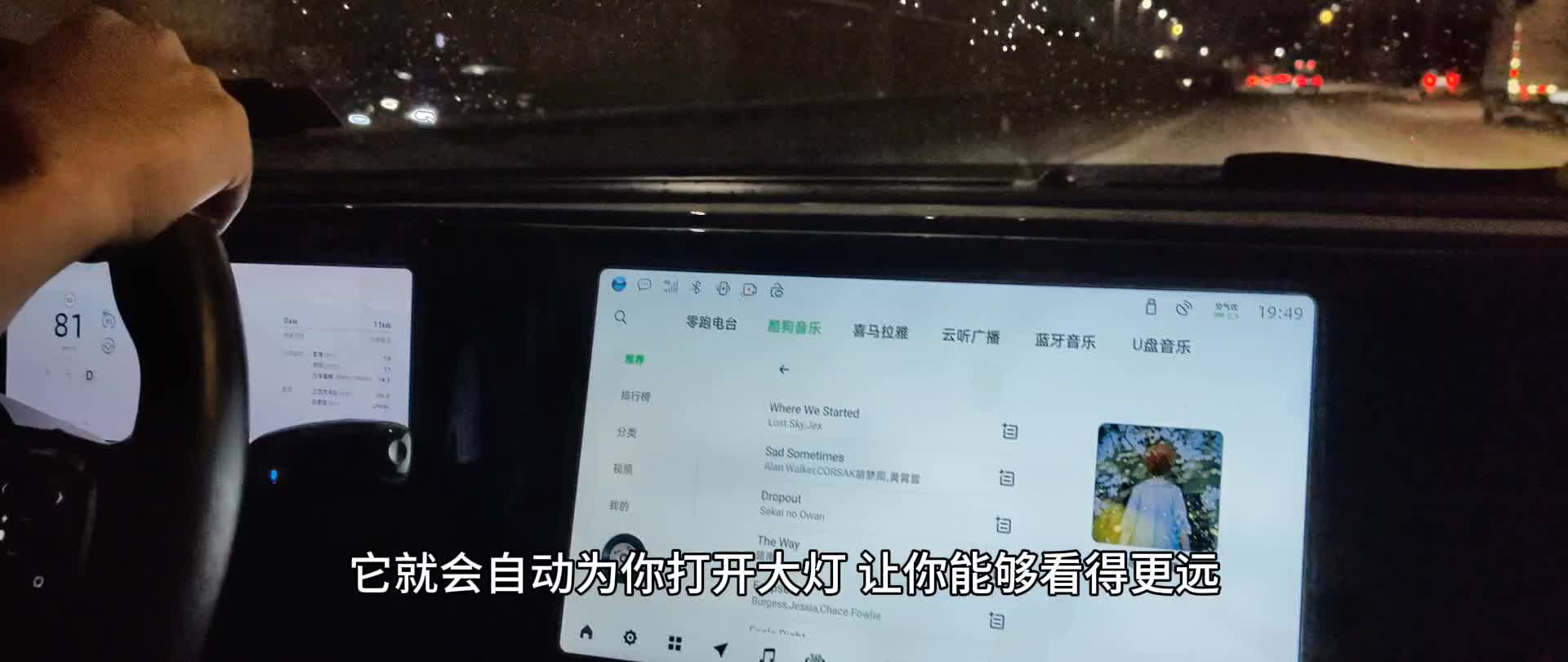 各位零居,晚上开车,记得注意车前大灯是否开启,因为这是个人安全和对他人的一种尊重。 仪表盘左上角会提示是否开启大灯,如果你忘记开启大灯了,没关系,通过语音呼唤小零开灯,它就会自动为你打开大灯,让你能够看得更远,更清晰。 在这个忙碌的都市生活中,即使是晚上出门,因为有零跑C11陪伴,让我们在驾驶的过程中更加安全、便捷。