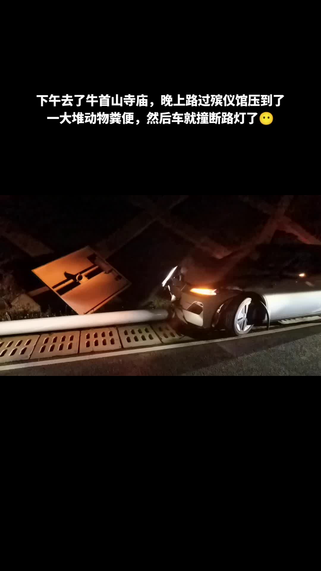 下午去了牛首山寺庙,晚上路过殡仪馆压到了一大堆动物粪便,然后车就撞断路灯了😶